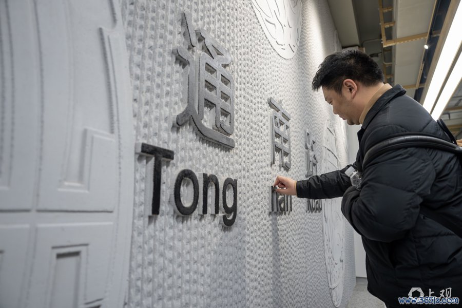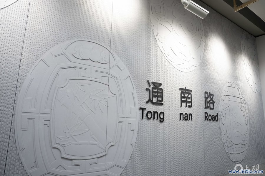 通南路站主打暖浅木色,温润得志,站名墙浮雕呈现传统淞南蛋雕非遗身手。