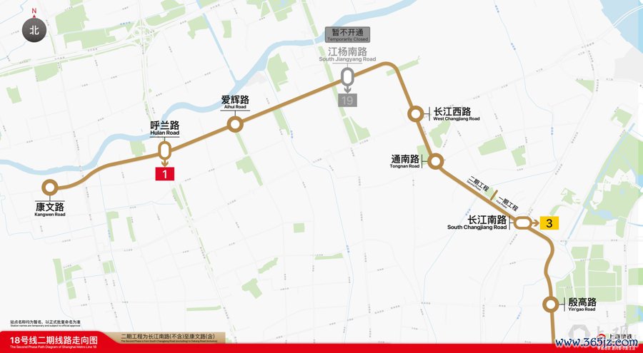 18号线二期工程起于一期工程长江南路站(不含),向北向西延长至康文路站,设地下车站6座,自东到西挨次为通南路站、长江西路站、江杨南路站(本次暂不同步通畅)、爱辉路站、呼兰路站、康文路站。其中,换乘站2座:呼兰路站以通说念+天桥的情景与既有1号线换乘;江杨南路站改日将与19号线(在建中)换乘。